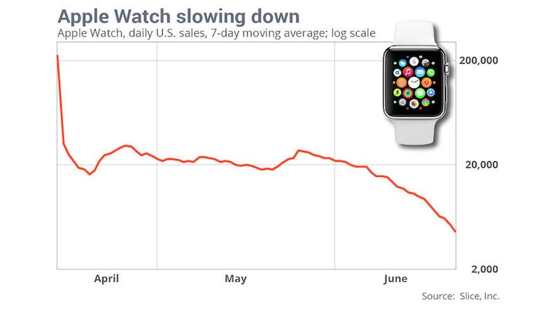 See that “slide” in June? Looks pretty bad for the Apple Watch doesn’t it? Well, when you learn how Slice gets their data – from the email receipts for purchases made online by persons in the US who’ve opted in to be tracked by Slice in return for other services – you realize a few important things.